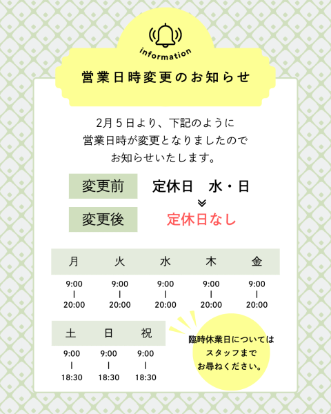 そのため、今まで定休日であった水曜日・日曜日にも営業をする運びとなりましたので、お知らせいたします✨