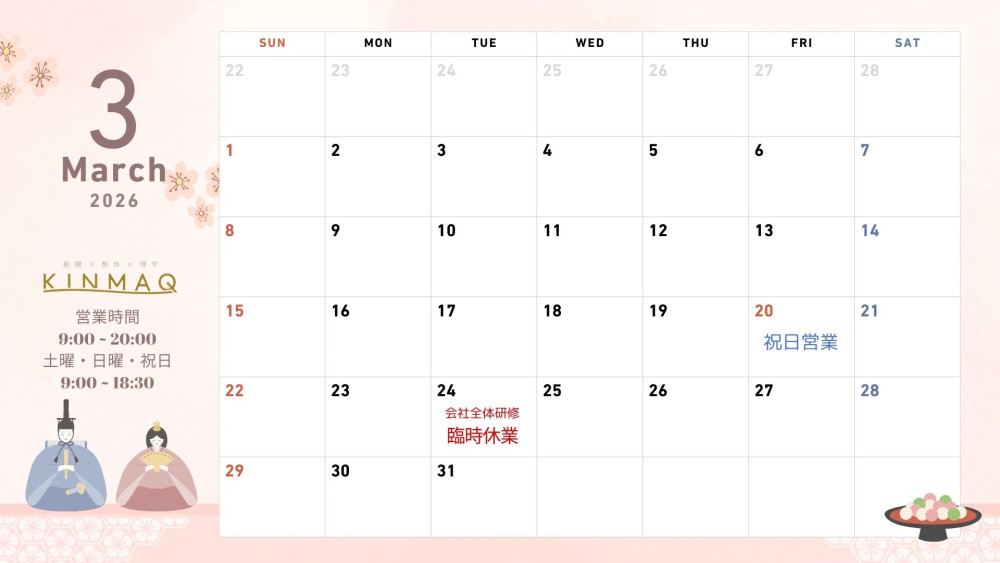 ・3月20日(金)祝日(春分の日)のため9:00~18:30